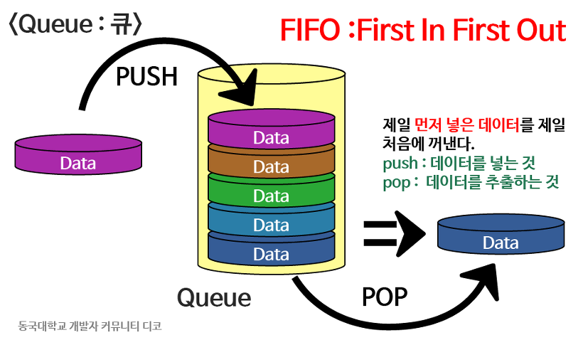 먼저 큐는 선입선출(FIFO) 구조를 가지고 있다. 제일 먼저 넣은 데이터가 가장 먼저나오게 되며, 큐의 앞부분을 front, 뒤를 back이라고 한다!